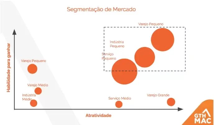 Já no gráfico abaixo, proveniente de um outro exemplo fictício, nota-se que o varejo pequeno se destaca em ambas as variáveis. Nesse caso, esse ramo seria a melhor escolha para o perfil ideal da empresa: