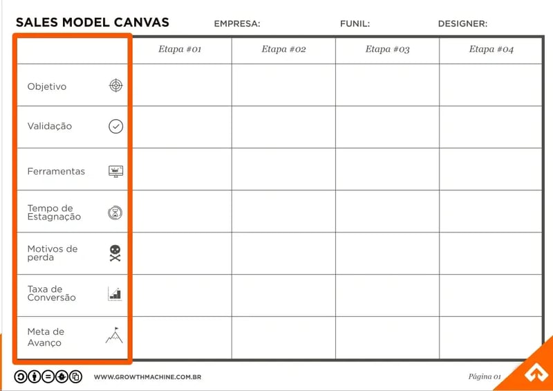 O Sales Model Canvas é composto por Etapas que são definidas de acordo com o funil selecionado – como por exemplo, pré-vendas, vendas ou pós-vendas – assim como pelas necessidades impostas pelo modelo de negócios que sua empresa atua.